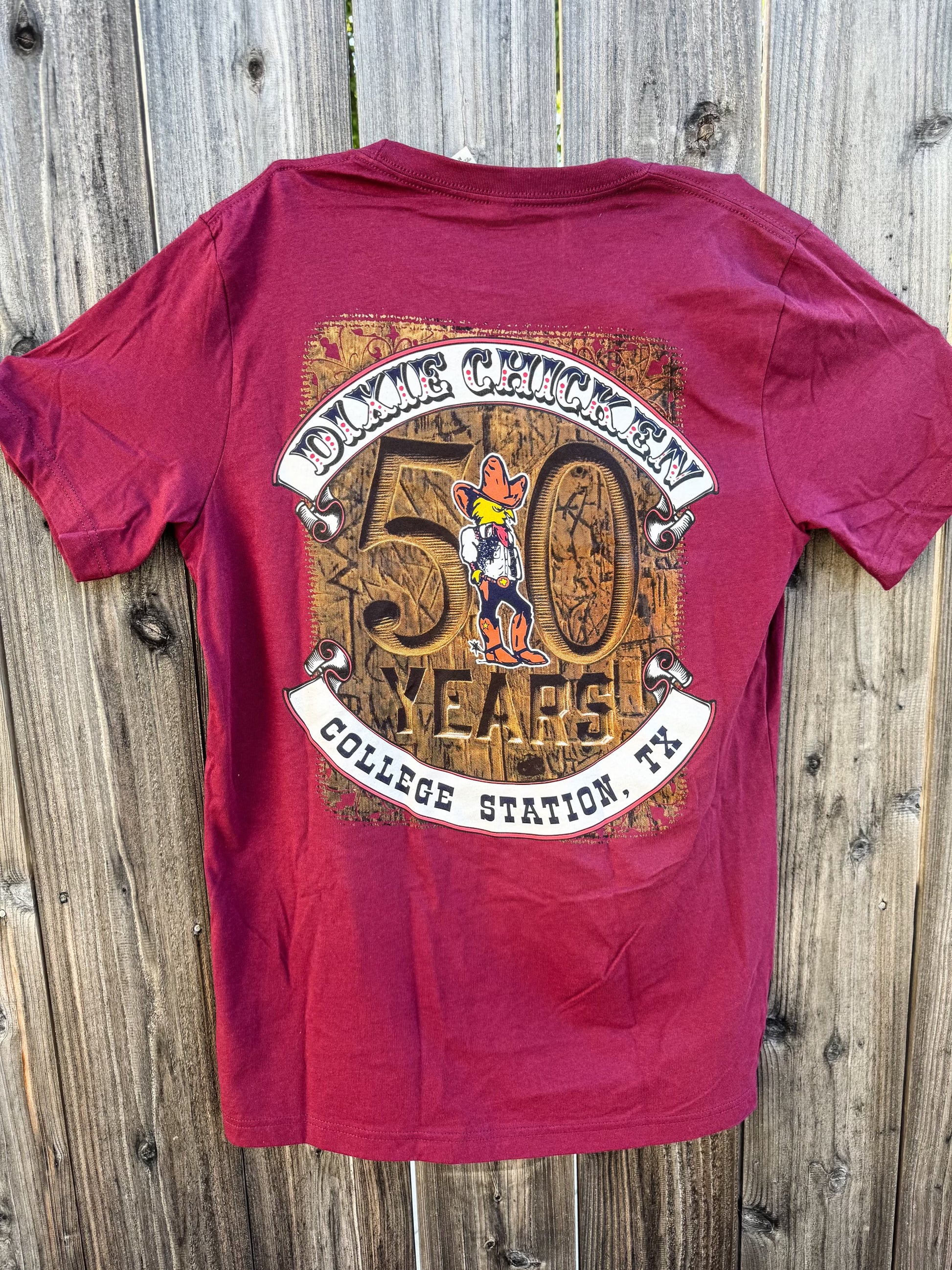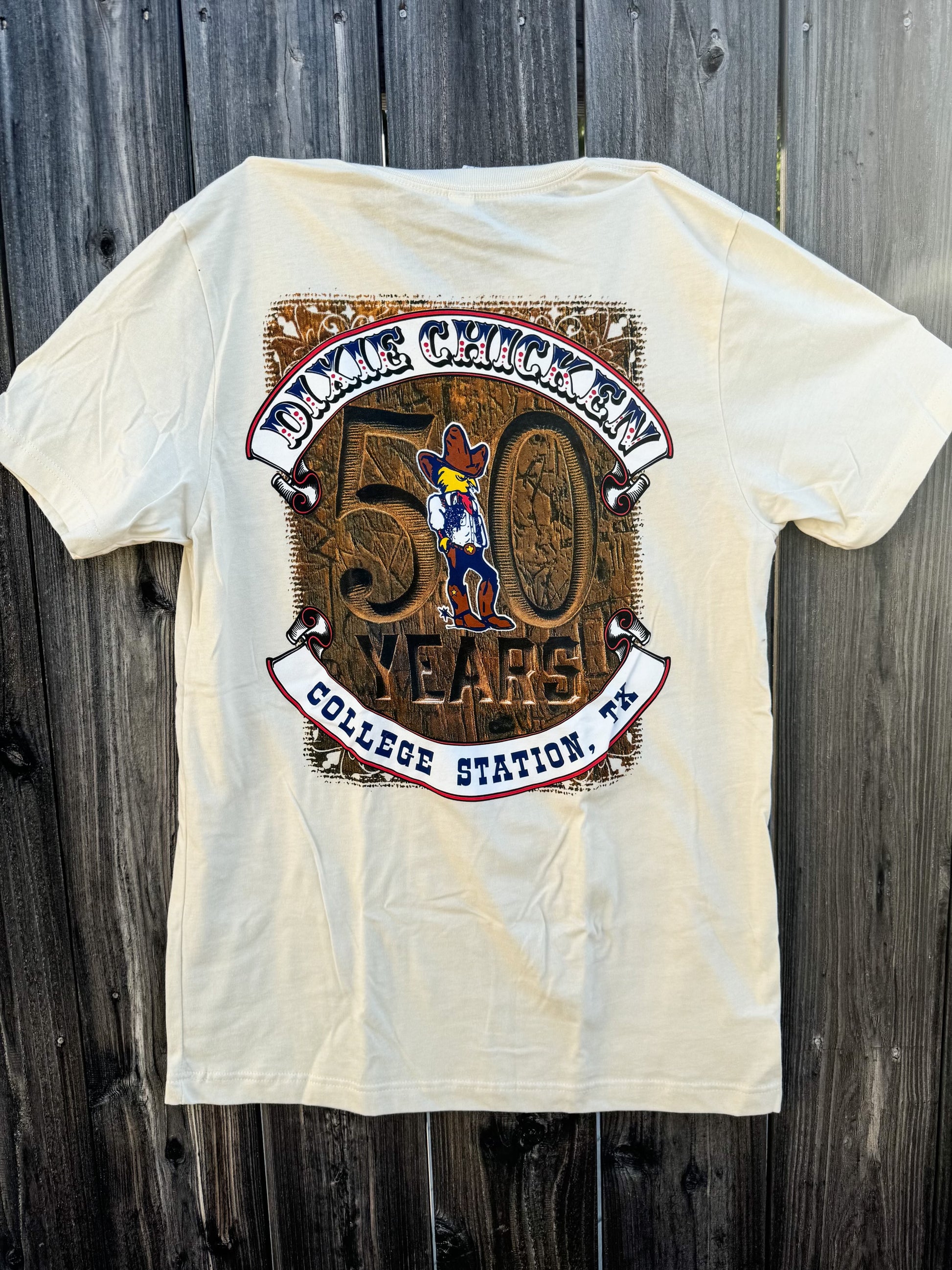 Whether it's good conversations, splitting a pitcher of beer, or playing 42 until Goodnight Irene comes on, all of these moments happen around Dixie Chicken Tables. We made these shirts to celebrate our 50th birthday in hopes of paying tribute to where some of the best Dixie Chicken memories are made.