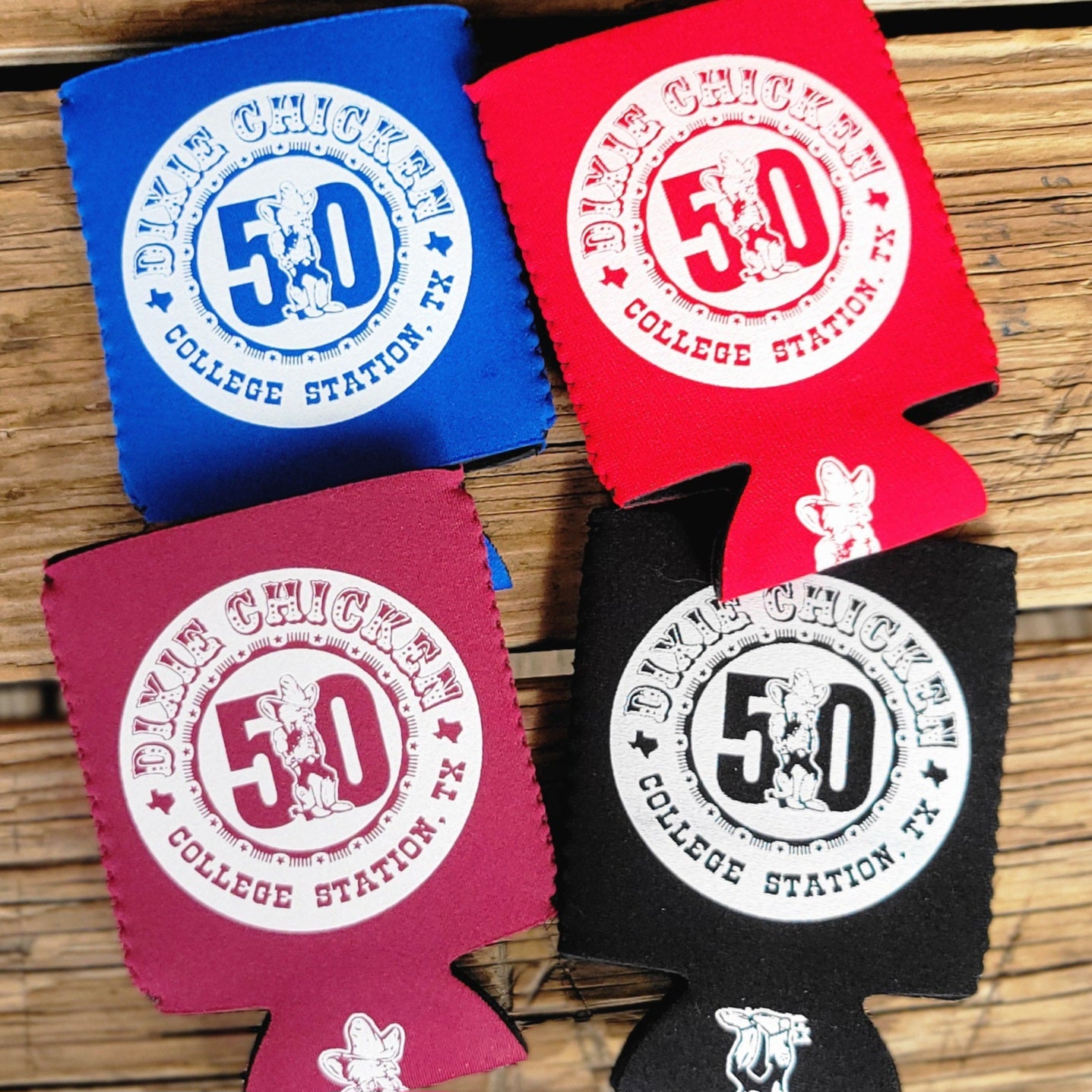 Celebrate 50 years of the Dixie Chicken with your favorite longneck or can in one of these new koozies! The high quality neoprene will keep your cold one from sweating all on your hand and it'll help you remember the good times you've shared with friends through our swinging doors.