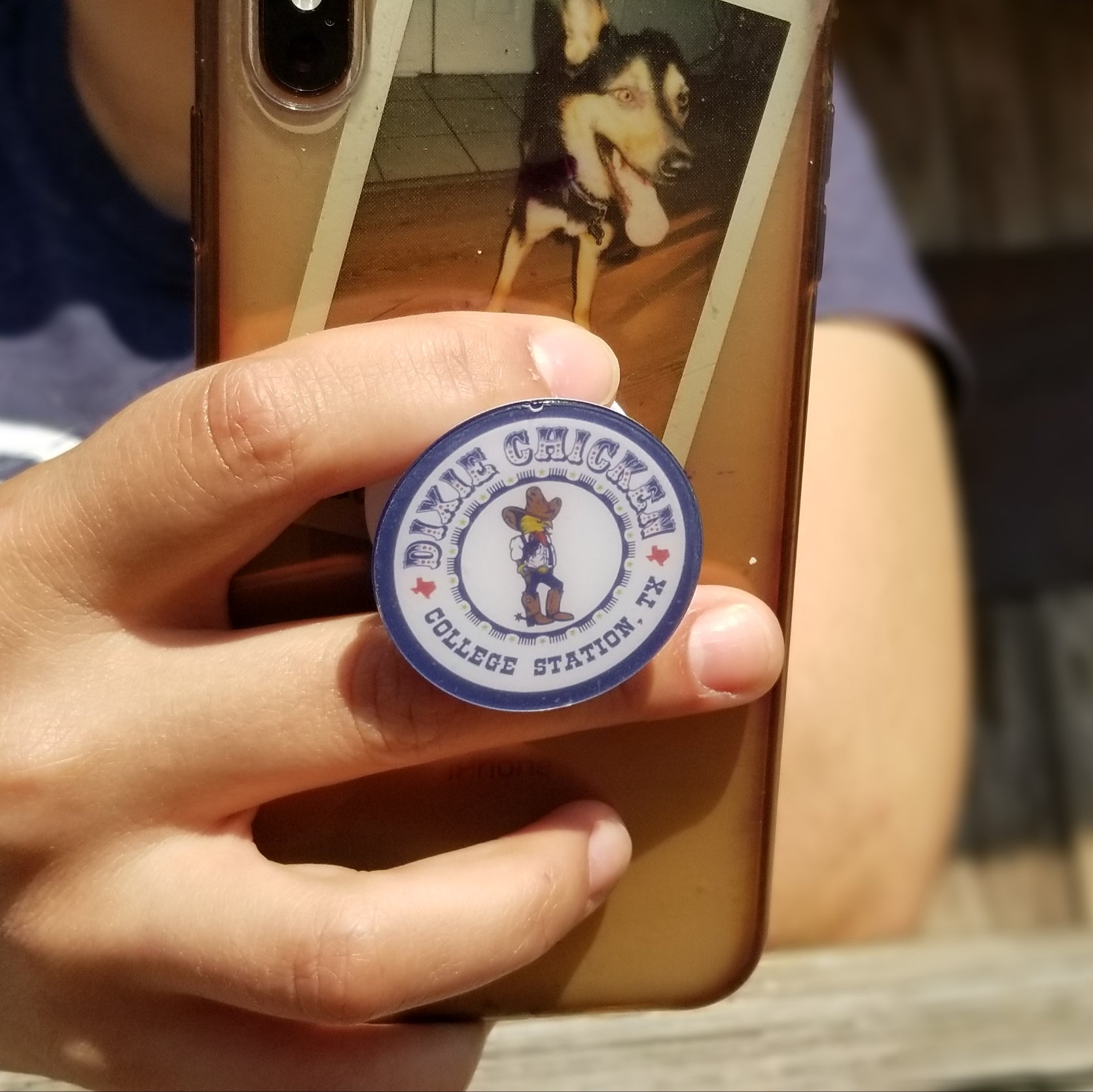 Keep your phone safe and secure in your hands with the Dixie Chicken! Our phone socket offers you a secure grip whenever you're browsing DixieChicken.com or whatever else you do with your phone. The adhesive sticks to most phones and cases.