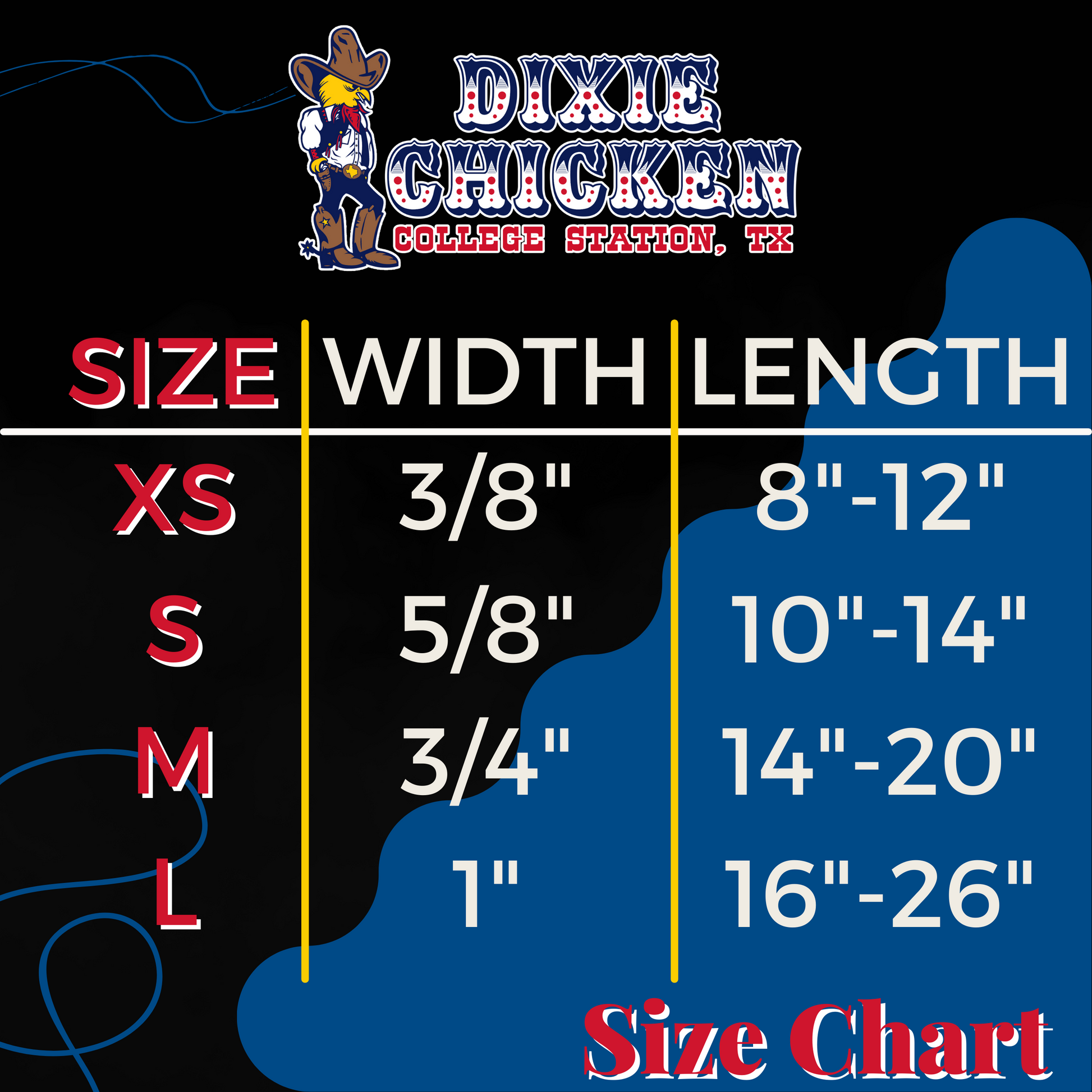 For all of our dog-loving friends, we've got Dixie Chicken dog collars! Available in 4 sizes from XSmall to Large so whether you've got a Chihuahua or a German Shephard, they can look their best in the dog park with a little Dixie Chicken flair.