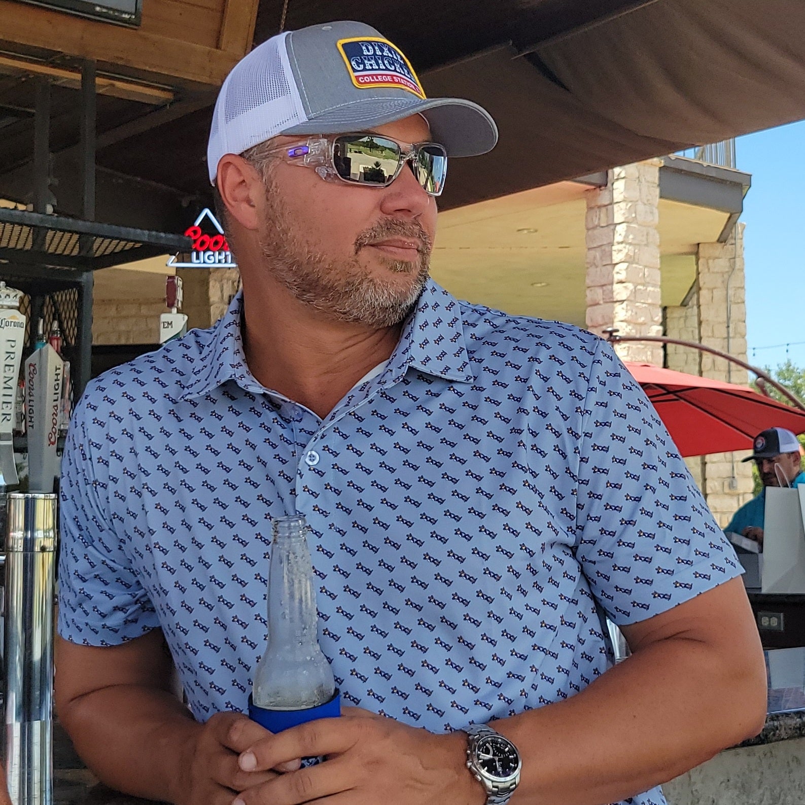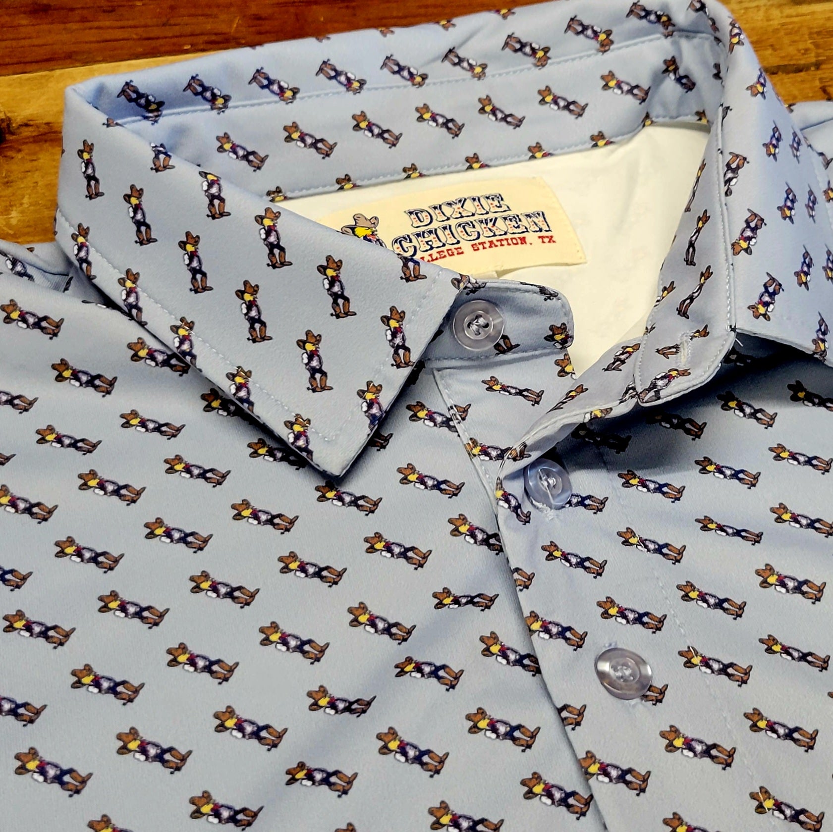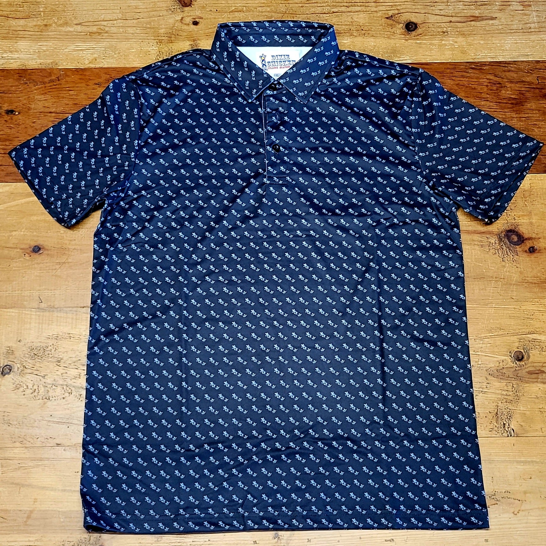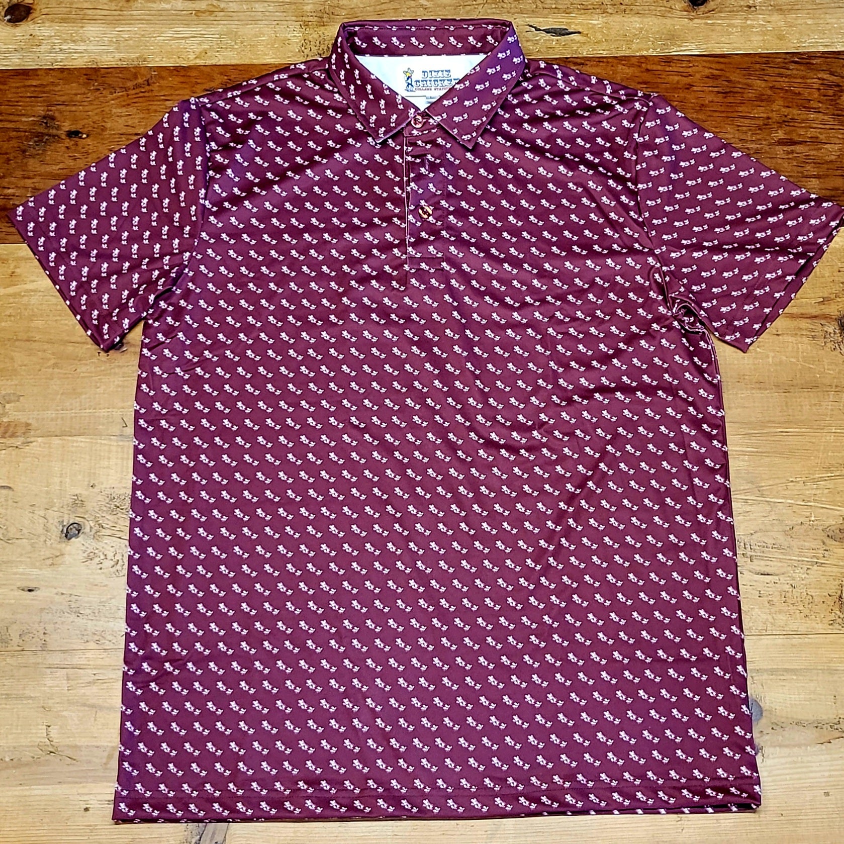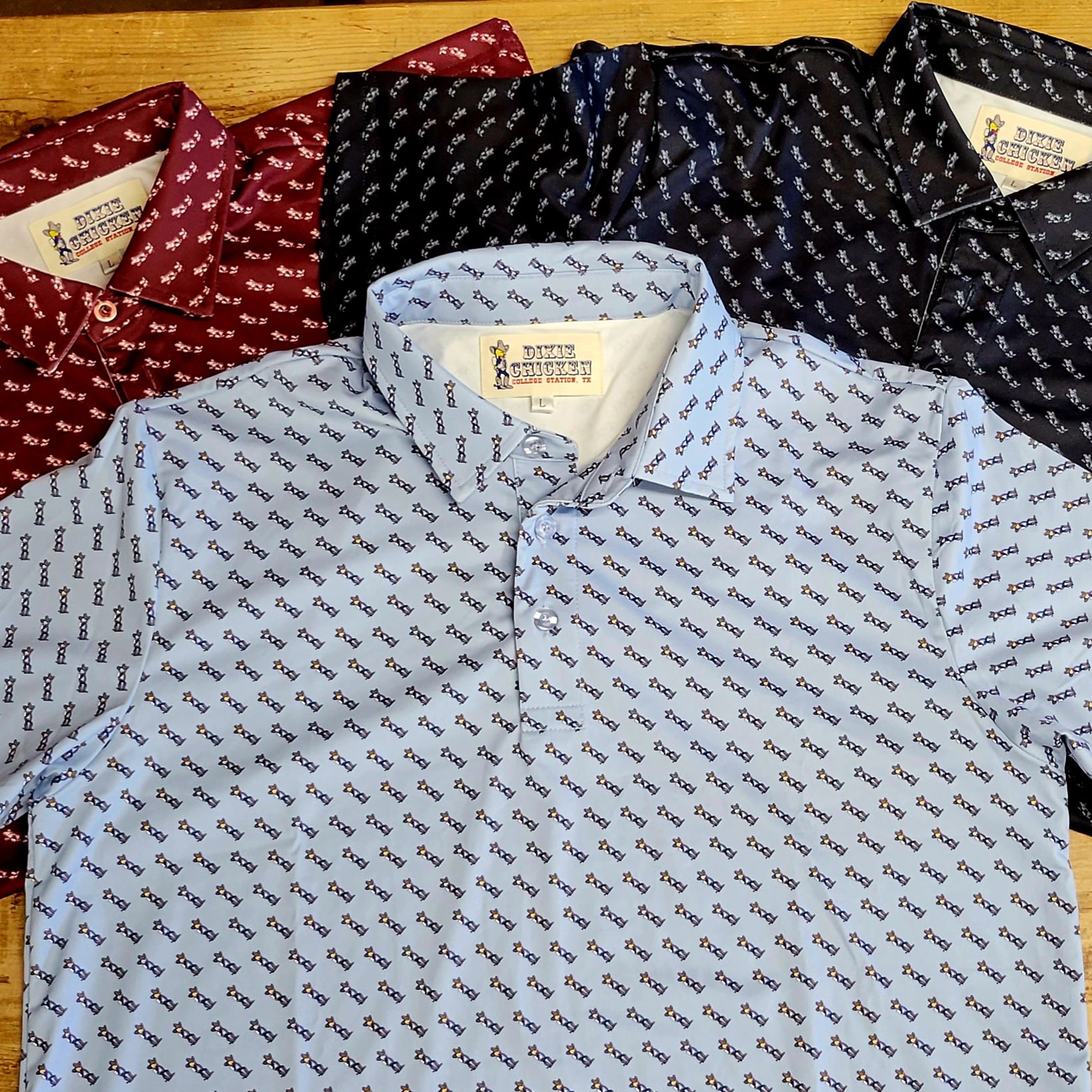Fly high off of the tee box with our Dixie Chicken Golf Polos! Take your pick of maroon, black or light blue when you hit the links. Each shirt is lined with our Bird logo all over. The maroon shirt has white birds, the black has gray birds, and the light blue has full-color birds.