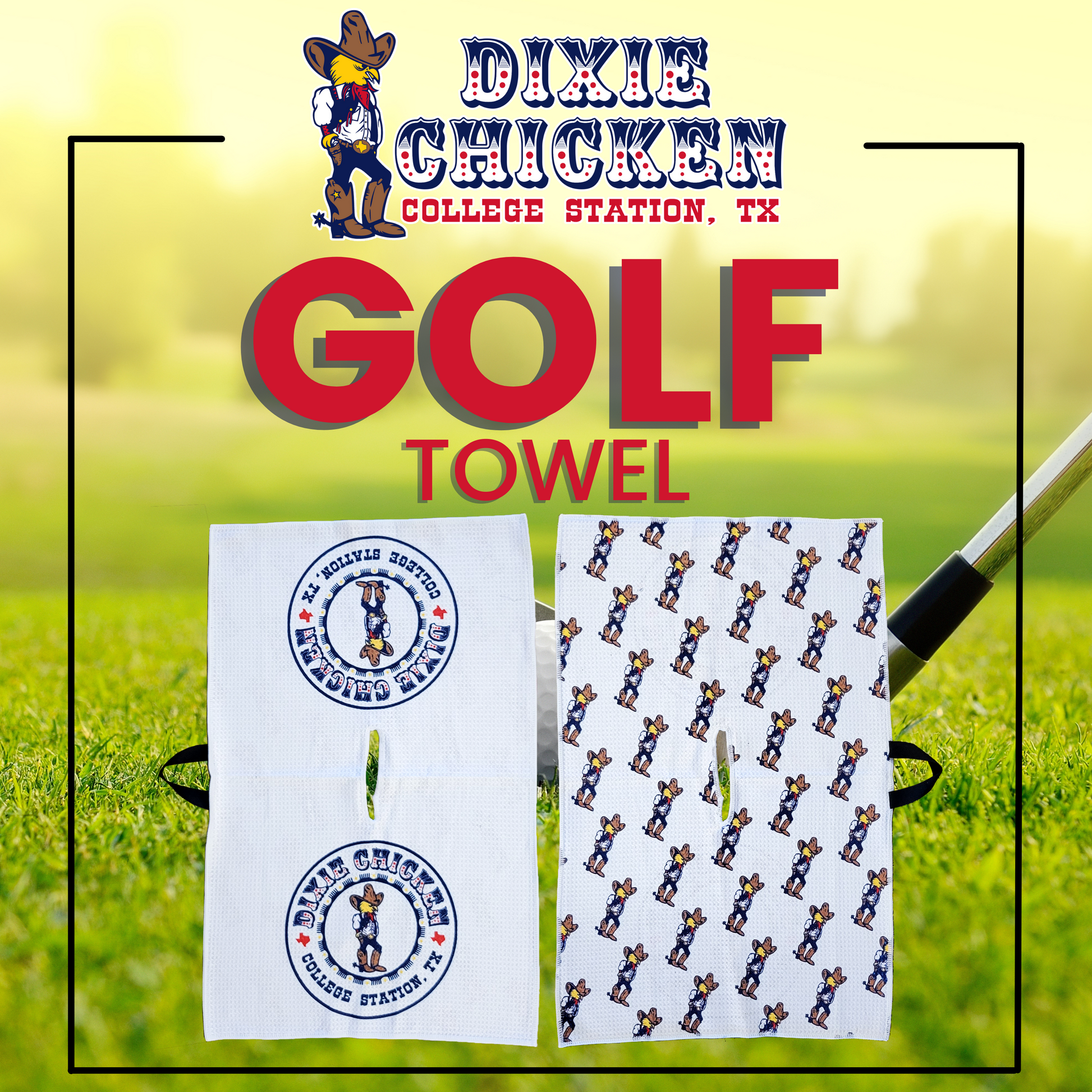 Hit the links and keep the Dixie Chicken with you with our Golf Towel! This dual-sided, waffle knit towel has our classic Circle Logo on one side and the iconic Bird on the other. With a slit in the middle, it can go right on your clubs or hang it with the loop on the side. Even if you're not Masters ready, you'll look great on the course with the Dixie Chicken Golf Towel!