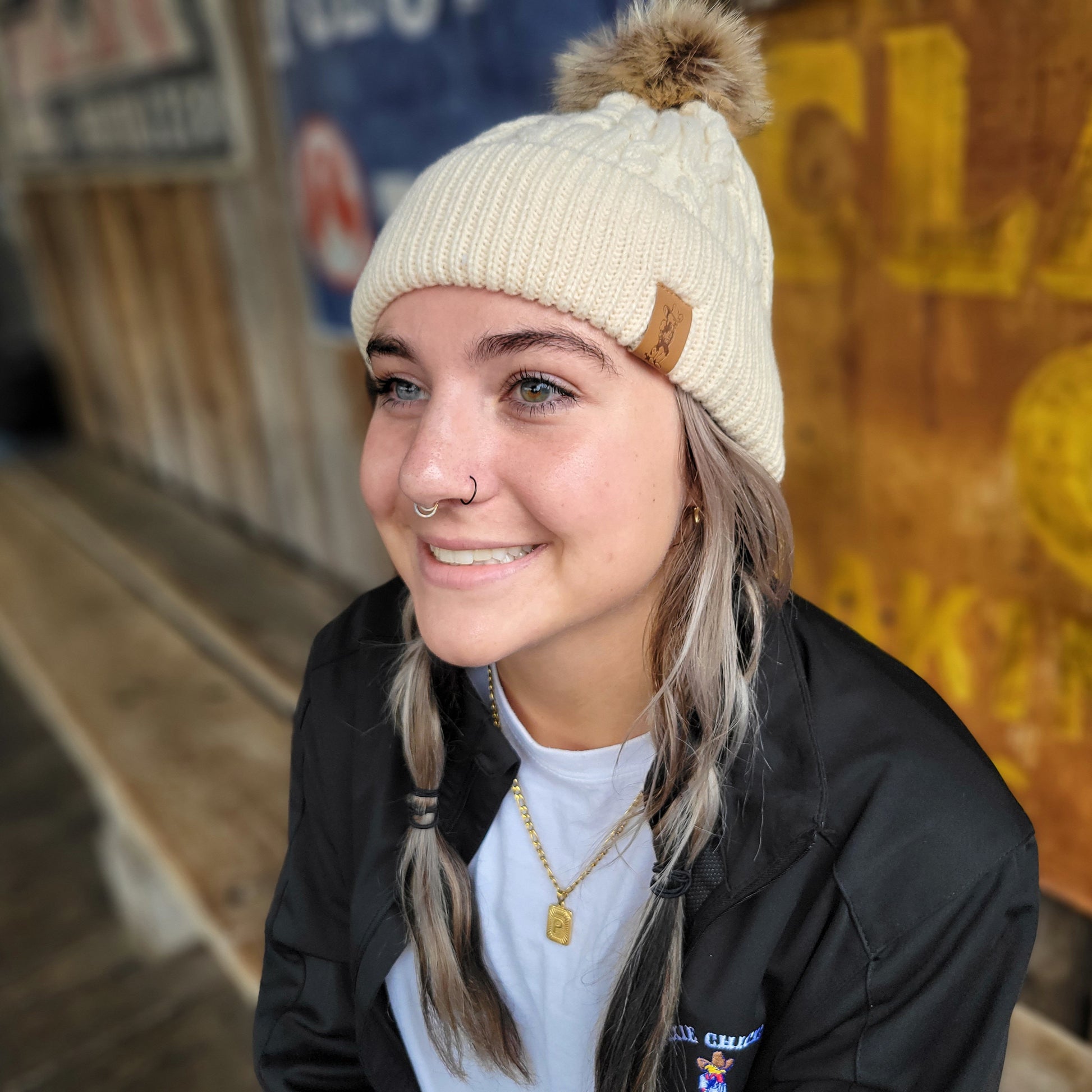 With its snug fit and fold-over cuff, this beanie offers a cozy and secure feel, hugging your head and keeping the cold winds at bay. Whether you're hitting the slopes, strolling through a winter wonderland, or simply running errands on a cold day, the Dixie Chicken Knit Pom Beanie ensures you stay warm while looking fabulous.