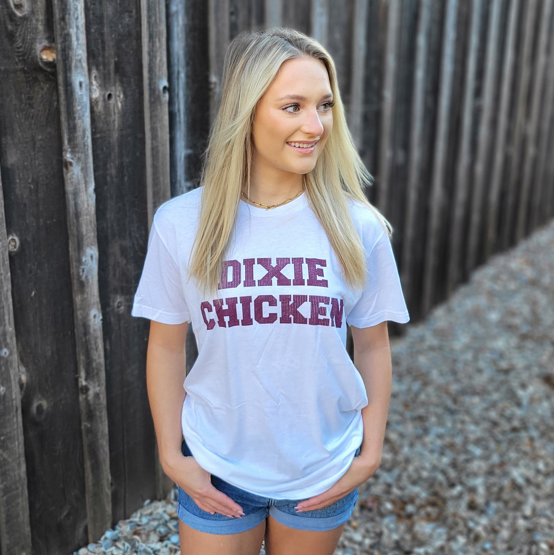 It'll look great heading to white-out Reed Arena or wherever else you wanna show up looking smooth in your icy white Dixie Chicken t-shirt!